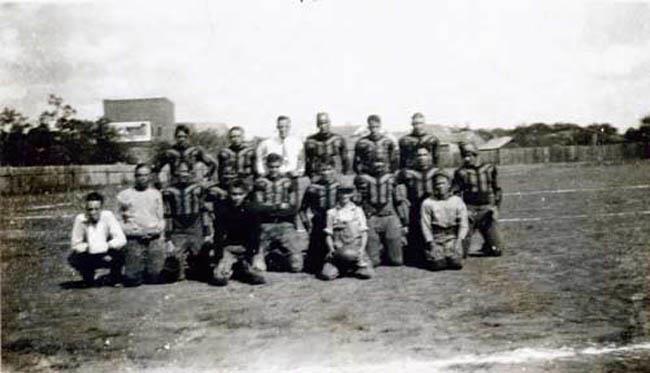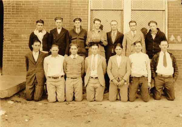 The Irving High School football team poses for photo during summer practice at Bridgeport, Texas, 1929.
