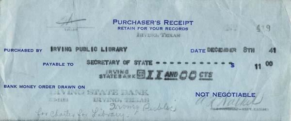 Mrs. Hurwitz had planned to start a library in Irving as early as 1936, but the plan never came to fruition. Perhaps her inspiration for the 1941 library came from the Dallas County Library System, which gave each member library $25 a month.
