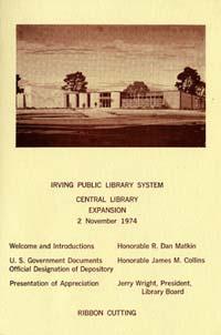 By 1960, Irving’s population had exploded to 45,985, and the library building was too small to meet the public’s needs. City government support of the Irving Public Library, a private enterprise, was limited to minimal funding for salaries, books and building repair. Recognizing the need to expand library services, the city council decided to establish a municipal library.
