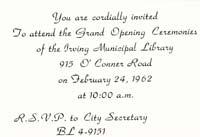 The new 2,100-square-foot library building housed approximately 8,200 items. Irving residents founded a friends group, the Irving Municipal Library Association, to supplement the library’s budget. Later in 1962, Mrs. Verna Dornbluth was named librarian, and she served in the position until 1966.