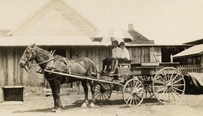 Description: Before opening his store in Twin Wells, H. P. Hinton, Sr., had a store in Irving. This horse and wagon, in which two of his sons are seated, was used for deliveries.