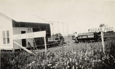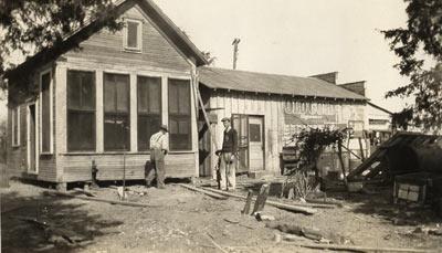 Description: Tom Ross Hinton established Twin Wells Lumber in 1928. In this photo, lumber sheds are under construction.
