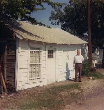 Description: Remnants of the office of the Twin Wells Lumber Company. The company was established by Tom Ross Hinton in 1928. In the photo, Harwood Hinton, Jr., younger brother of Tom Ross Hinton, stands at the remains of the office of the lumber company in 1988.