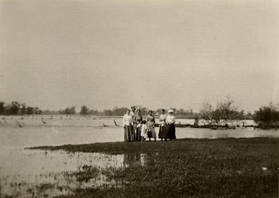 Description: Twin Wells community was located near the banks of the West Fork of the Trinity River. In 1908, the river experienced a devastating flood. Residents of the Twin Wells area pose by the flood waters.