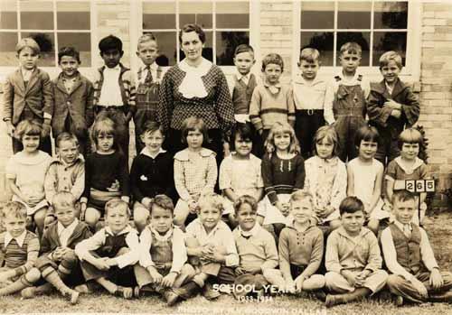 Description: Irving school's first grade class, 193334. The children of the Twin Wells community attended the Irving schools. Irving was about two miles west of Twin Wells.