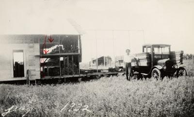 Description: The Hinton family lived in a house behind the Twin Wells store. In this photo, the house is being moved behind the store.
