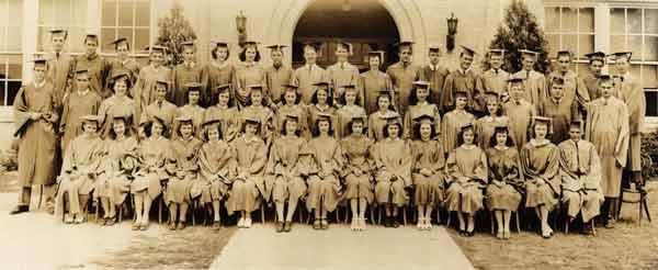 Description: Irving High School graduation class, 1944. The children of the Twin Wells community attended the Irving schools. Irving was about two miles west of Twin Wells.