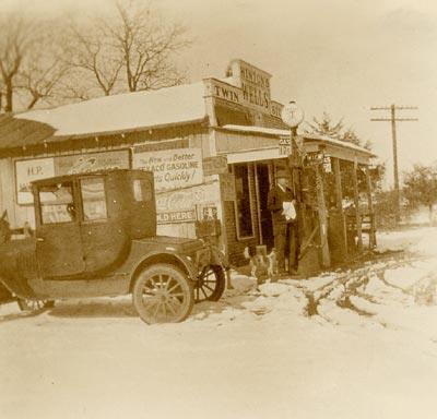 Harwood P. Hinton, Sr., was born in Marshall, Texas, in 1870. He moved to west Texas to live with relatives in 1891. In 1909, he traded his west Texas chicken farm for 63 acres in northwest Dallas County in the community of Twin Wells. He worked for a time tending draft animals at a refinery in west Dallas. In 1914, he traded part of his 63 acres for a store in the small town of Irving, which was about two miles west of his land. Hinton's first wife, Pinkie Elizabeth, with whom he had two sons, died in 1917. He married Lucy Wright in 1921. She preferred living on the land out at Twin Wells, so the family moved there with plans to open a store on their Twin Wells land. Their land was along the road from Dallas to Irving and areas further west. Before the store was finished, Lucy was killed in a train wreck. In 1924, Hinton opened Hinton's Twin Wells Store. He married Willie Mae Garner in 1926. The couple had one son. Hinton's second son by his first wife opened Twin Wells Lumber Company in 1928. In 1942, the Hintons sold the store and lumberyard and most of their Twin Wells land. H. P. Hinton, Sr., spent the final years of his life just across the river from Twin Wells in the Oak Cliff section of Dallas. He died in 1956.