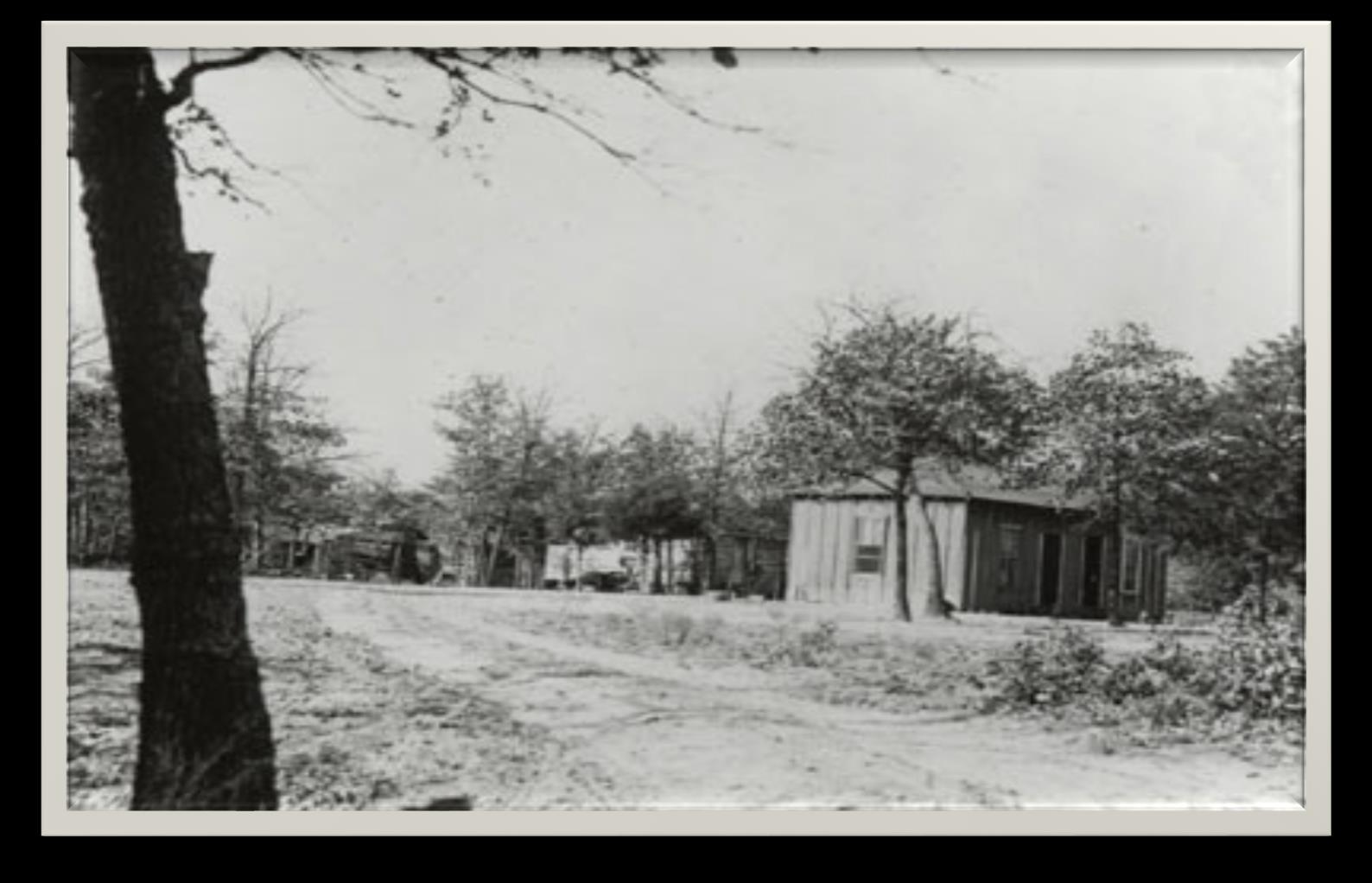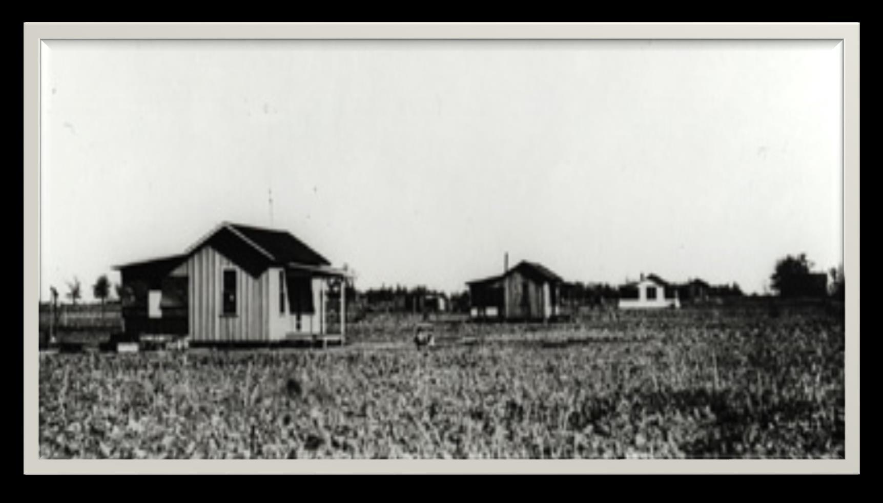 Description: Pictured here are small houses from the area around Irving in 1925. These houses sit in the midst of a plowed field. The soil around Irving is a sandy loam which was excellent for fruit and vegetable growing. The land to Irving's west and north was black land soil more suited to growing cotton.
