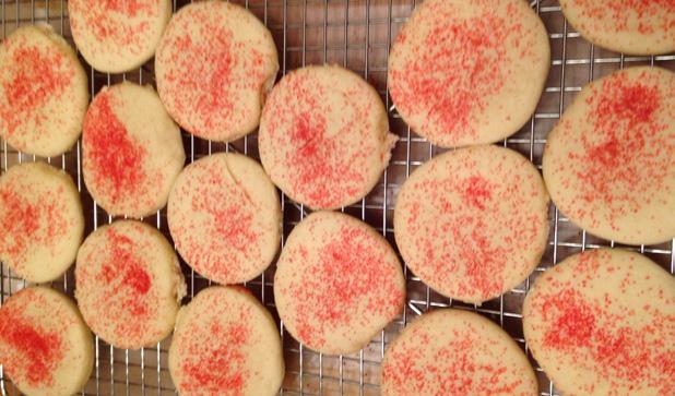 Preheat oven to 400. Get the eggs out of refrigerator to let them warm up a little. Soften the butter in microwave (30% power for 1 min, 15 seconds, or so). Beat eggs, sugar, and softened butter in a large bowl. I use a wooden spoon for this. Dissolve baking soda in buttermilk, briefly stirring to dissolve. Add vanilla. Put baking powder in your first cup of flour. Add flour until a stiff dough forms (for me, this is usually about 6 1/2 c flour). Lightly flour your counter, and rolling pin, roll out cookie dough a little at a time. You want the cookies fairly thick, but not too thick. I use a 2” cutter, but you can use a slightly larger cutter if you prefer. Place cookies on parchment-paper-lined cookie sheets. Sprinkle cookies with the tinted sugar - I use red tinted sugar at Christmas. Press sugar lightly into the tops of the cookies. Bake at 400 for about 7 minutes. You do not want the cookies to brown, but a slight golden brown around the edges is fine. Remove to a cooling rack.
