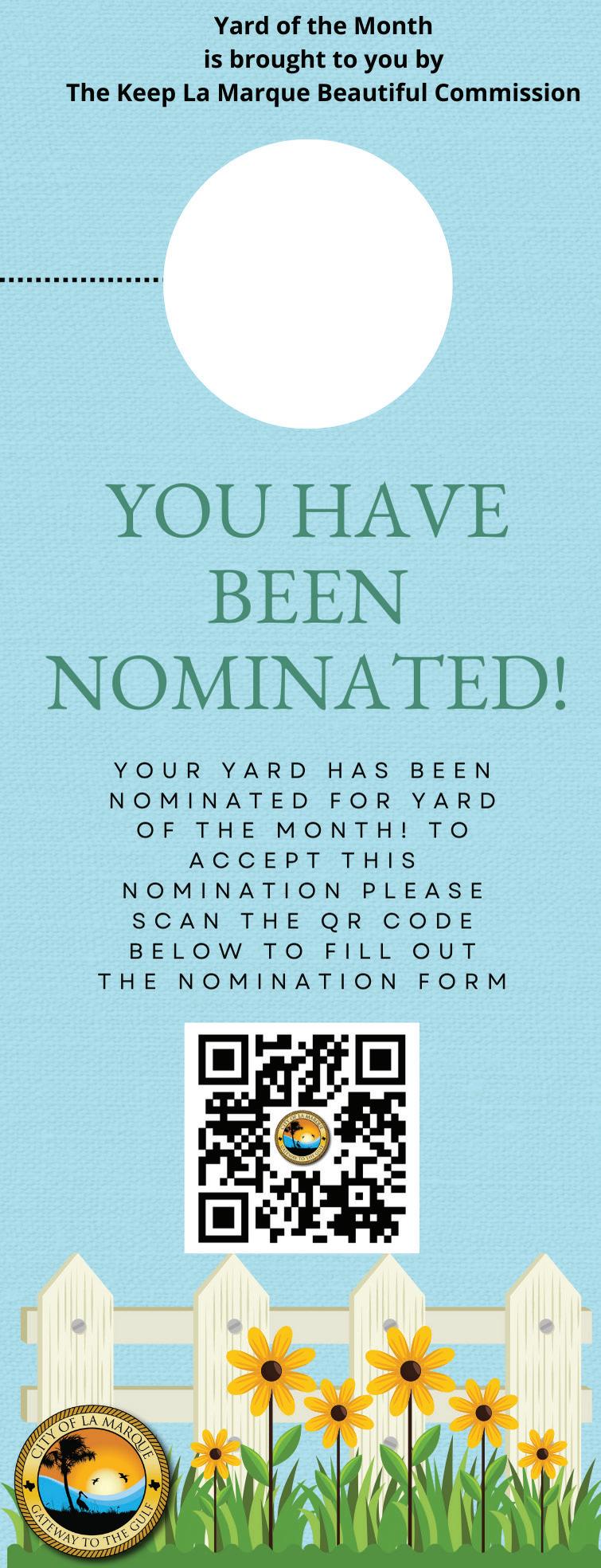 The Keep La Marque Beautiful Commission would like to recognize homeowners and businesses that go the extra mile to make their property shine. To nominate someone in our community, cut out this door hanger and place it on the doorknob of that homeowner or business.