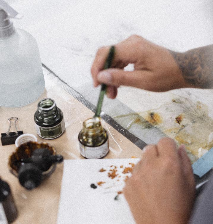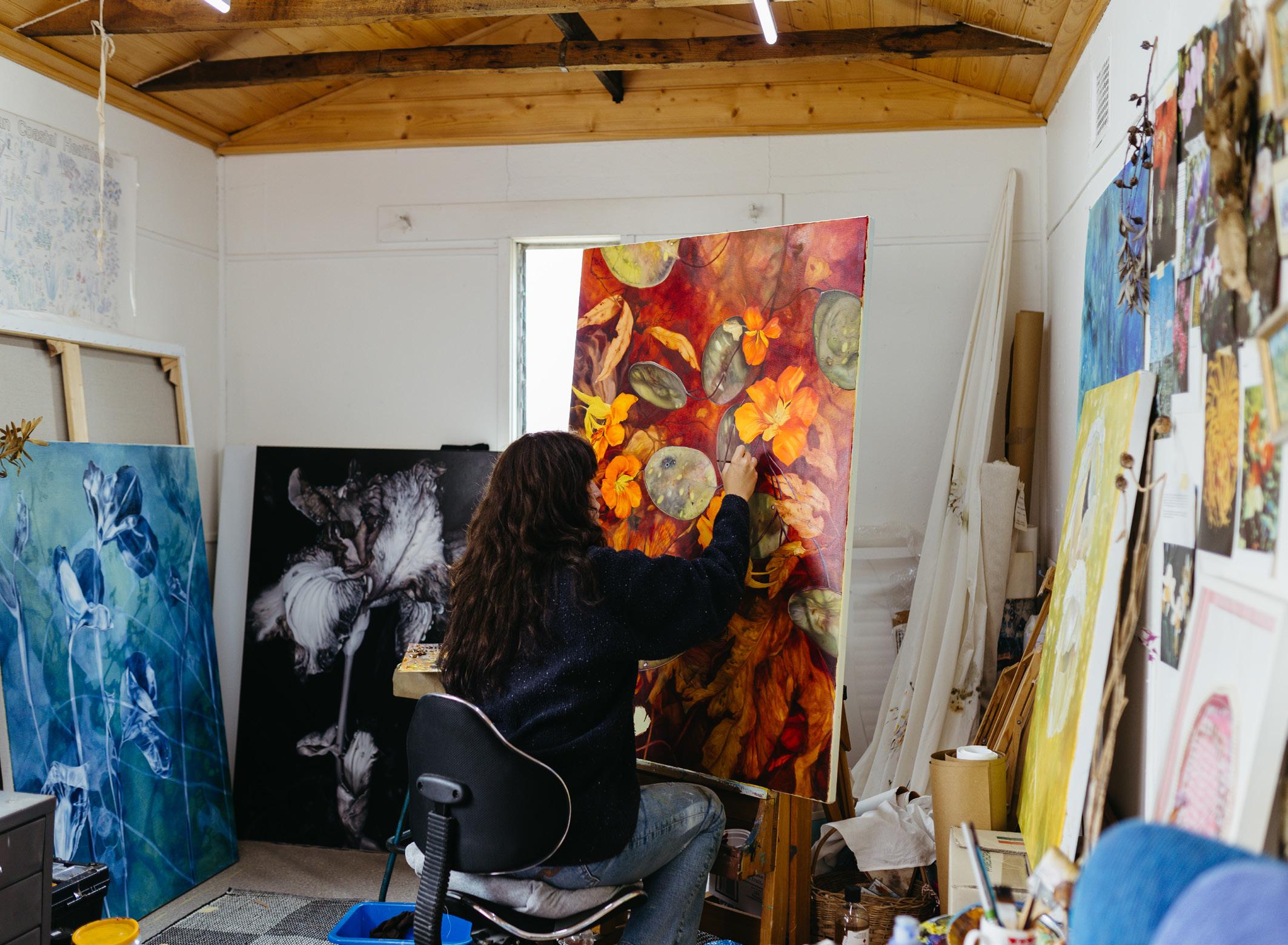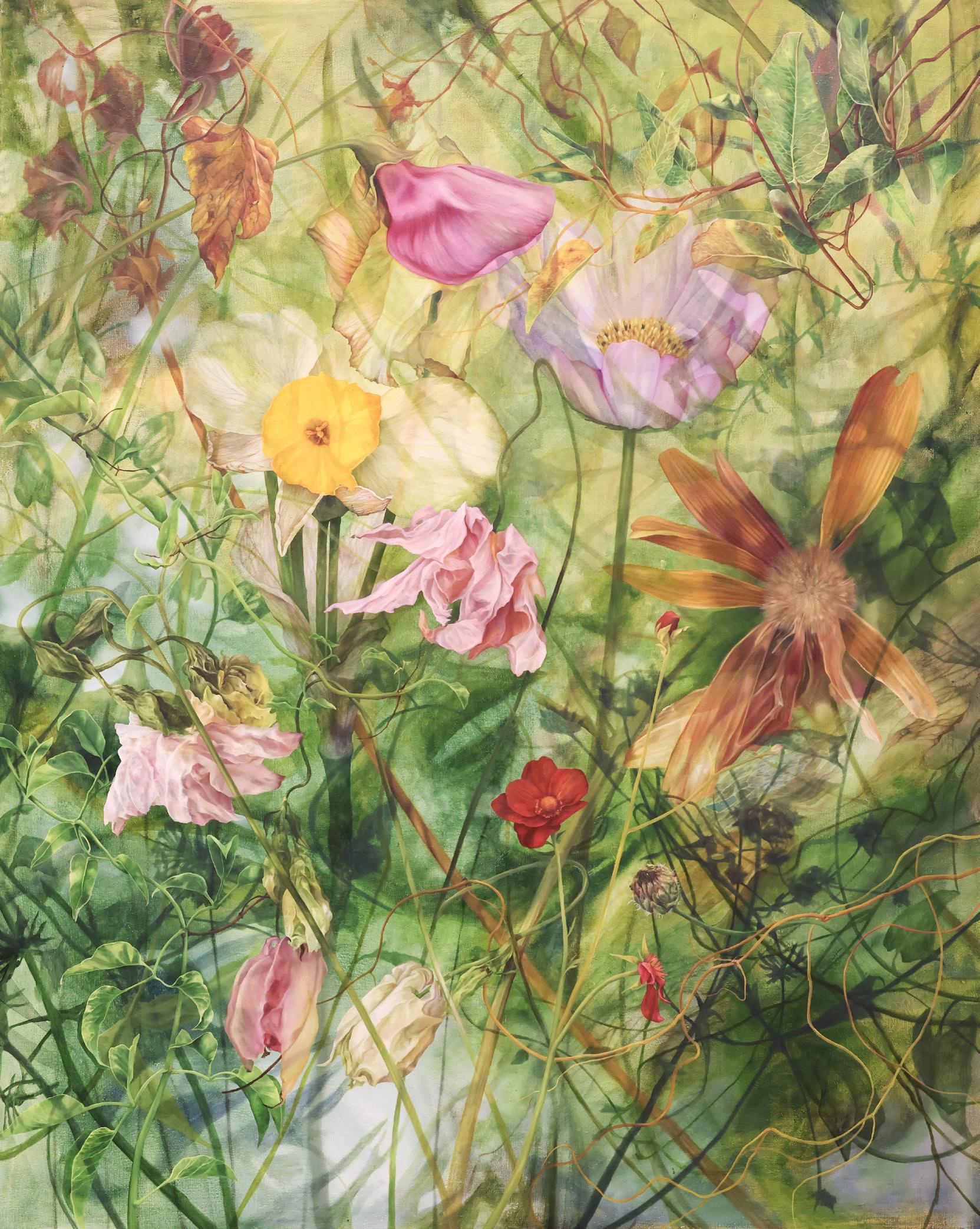 Inspired by a sense of childhood wonder, her botanical oil paintings explore the nature of remembering by layering plants, shadows and light. Central to her creative practice is a fascination with the detail found in our natural world. Maggie’s paintings are intended to become documentations of her experience, reminiscent of the ways she would explore as a child. Lately, this creative work has been questioning the ‘rewilding’ of her painting process, unfolding compositions which happen naturally through the collection of plants, and experiences.