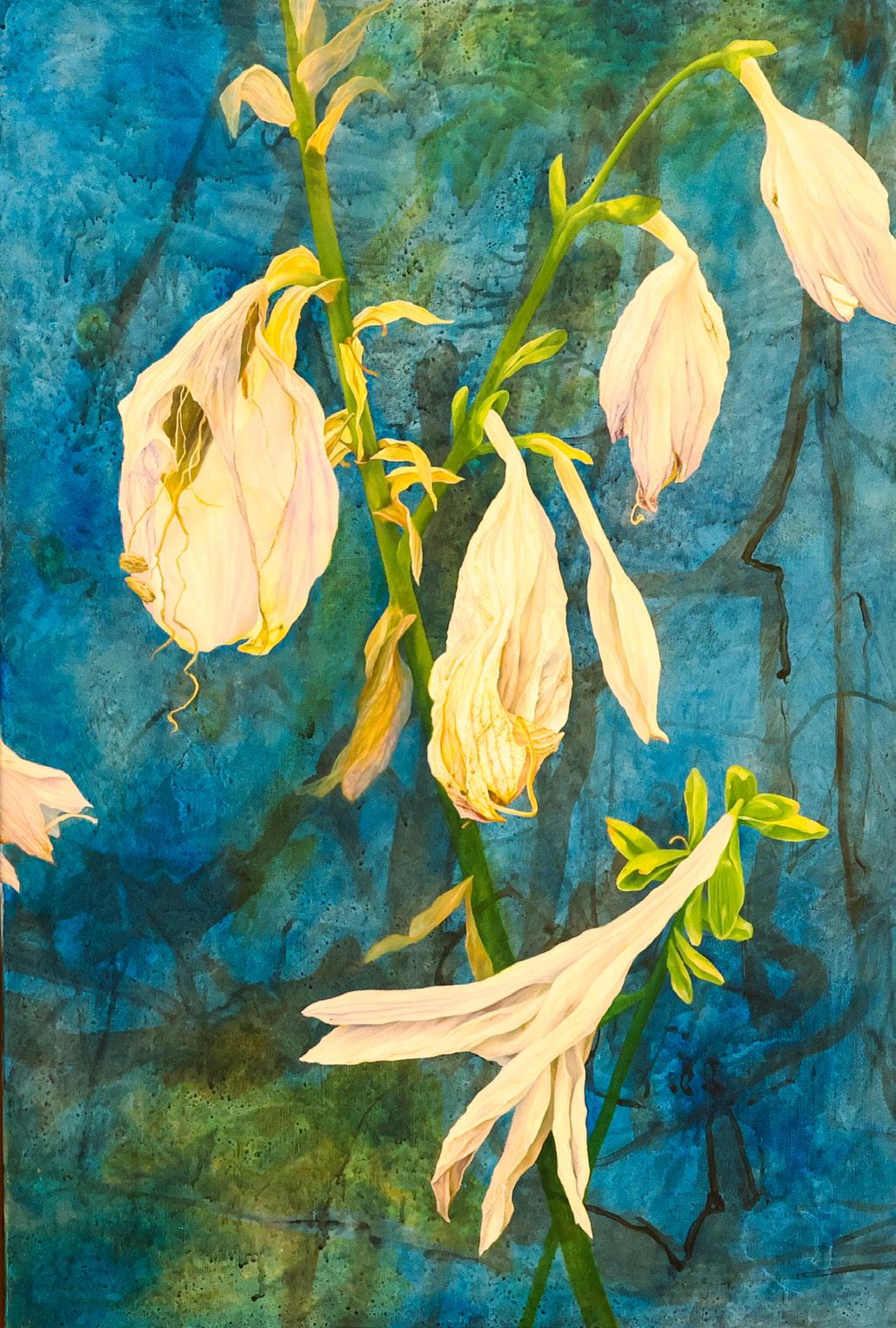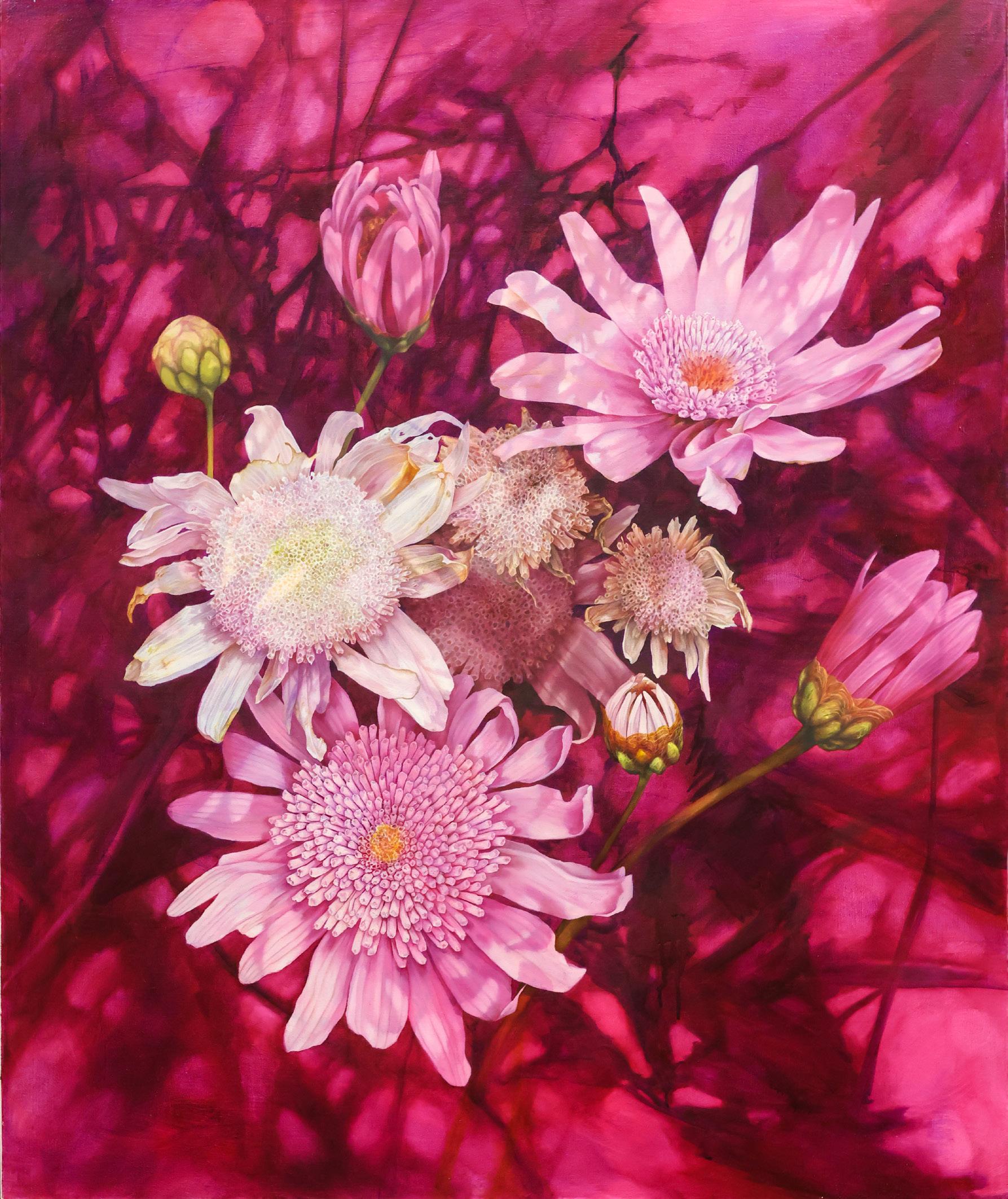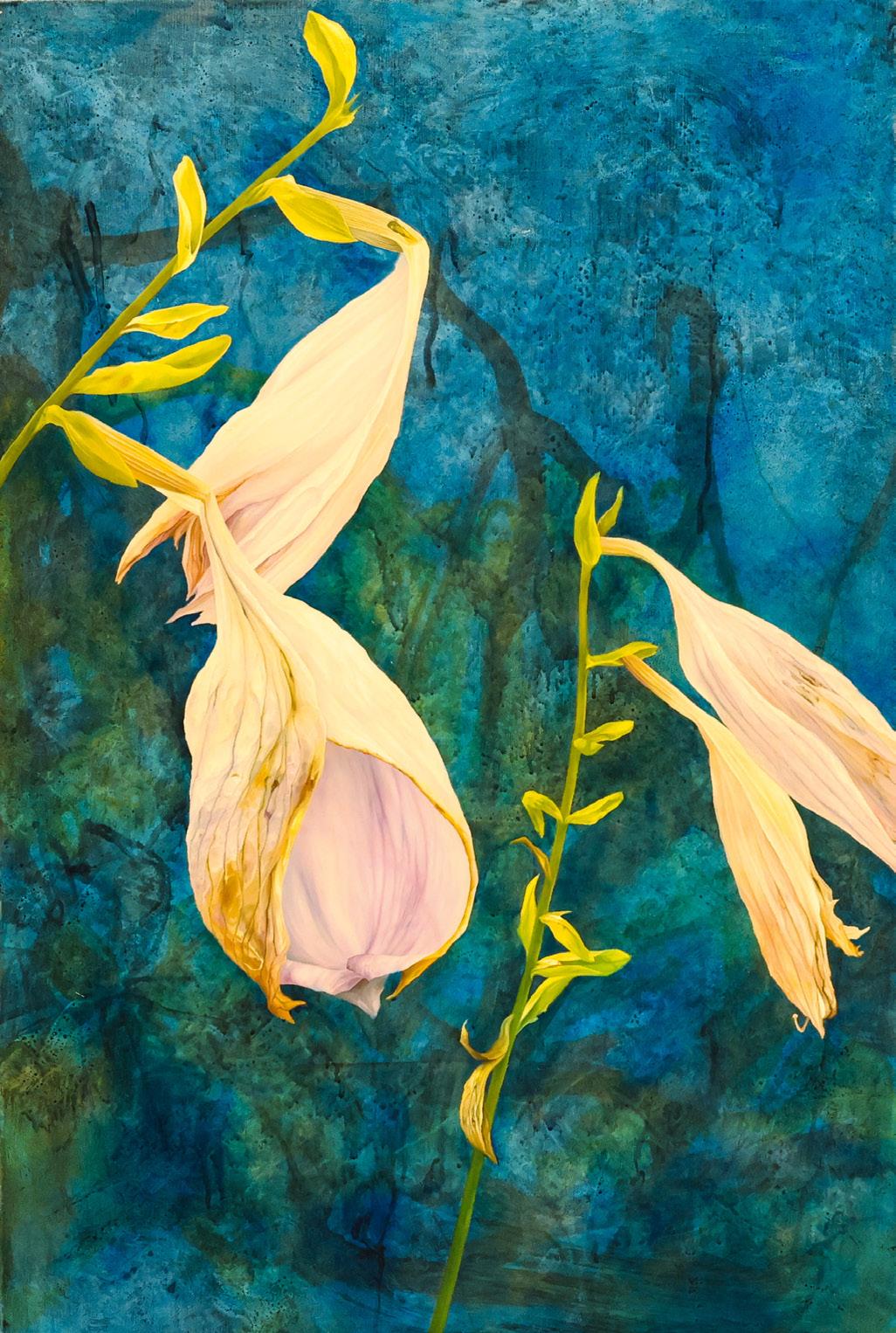 Inspired by a sense of childhood wonder, her botanical oil paintings explore the nature of remembering by layering plants, shadows and light. Central to her creative practice is a fascination with the detail found in our natural world. Maggie’s paintings are intended to become documentations of her experience, reminiscent of the ways she would explore as a child. Lately, this creative work has been questioning the ‘rewilding’ of her painting process, unfolding compositions which happen naturally through the collection of plants, and experiences.