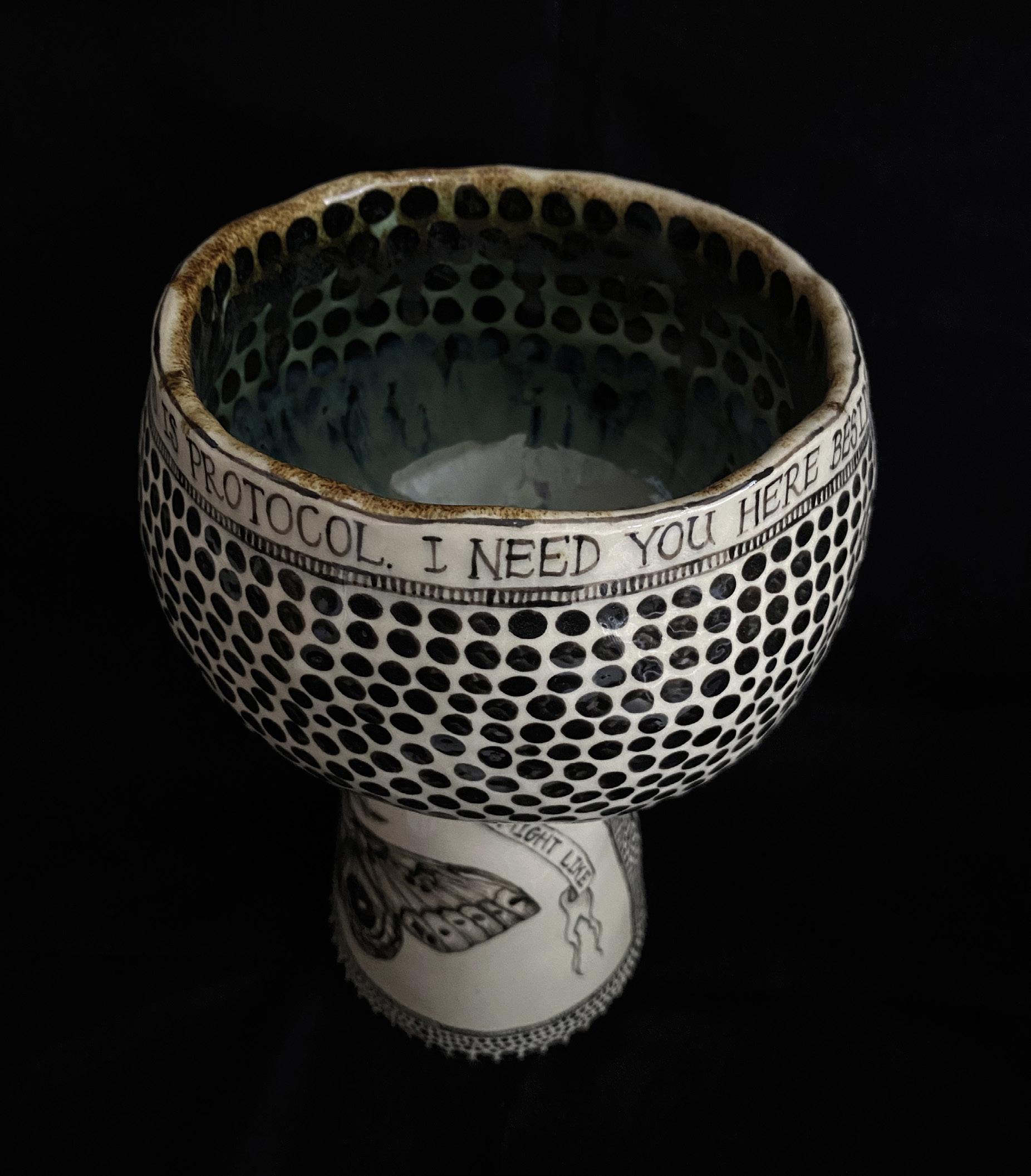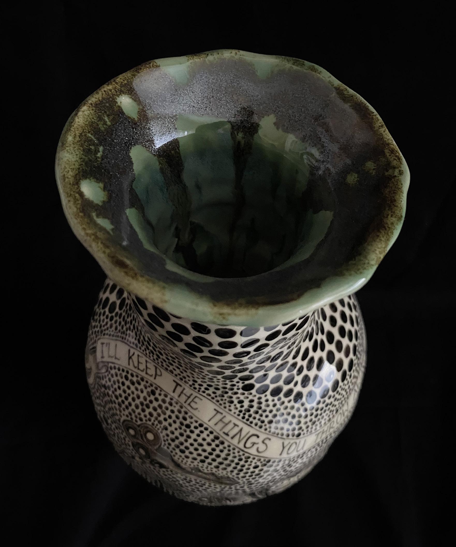 Song lyrics are also a defining feature of May’s work, with extracts of expressive verse wrapped around each piece. This stems from a personal obsession with music, but simultaneously helps to channel the emotional and personal connections that can only be found in song. As well as exhibiting the sheer joy of making and life’s small pleasures, May’s works also carries more serious undertones, reminding us of the importance of human connection. Underpinning May’s practice is a conscious aversion towards the traditions of ceramics, with works that embrace being eccentric and impractical. This is what makes them so fascinating, as well as being a timely reminder of a world that is increasingly unfamiliar.