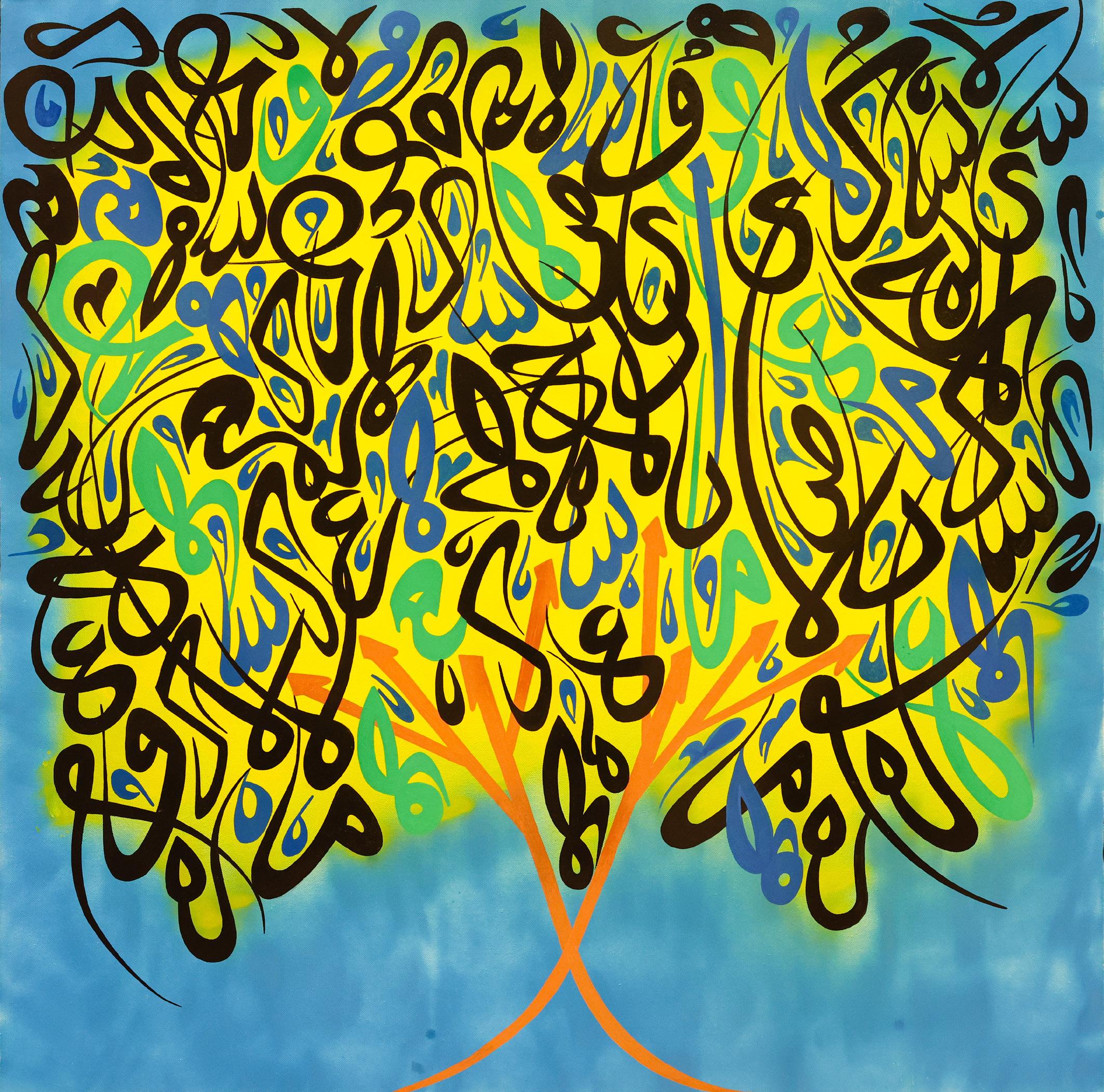 From this central root, the remaining Arabic letters rise and branch out, shaping the trunk and canopy of the tree. Each letter contributes to the whole, emphasising harmony in diversity and the deep connections that exist beneath surface differences. This work invites reflection on the idea that while we may take different shapes and paths in life, we are all part of one interconnected system, rooted together in our shared humanity.