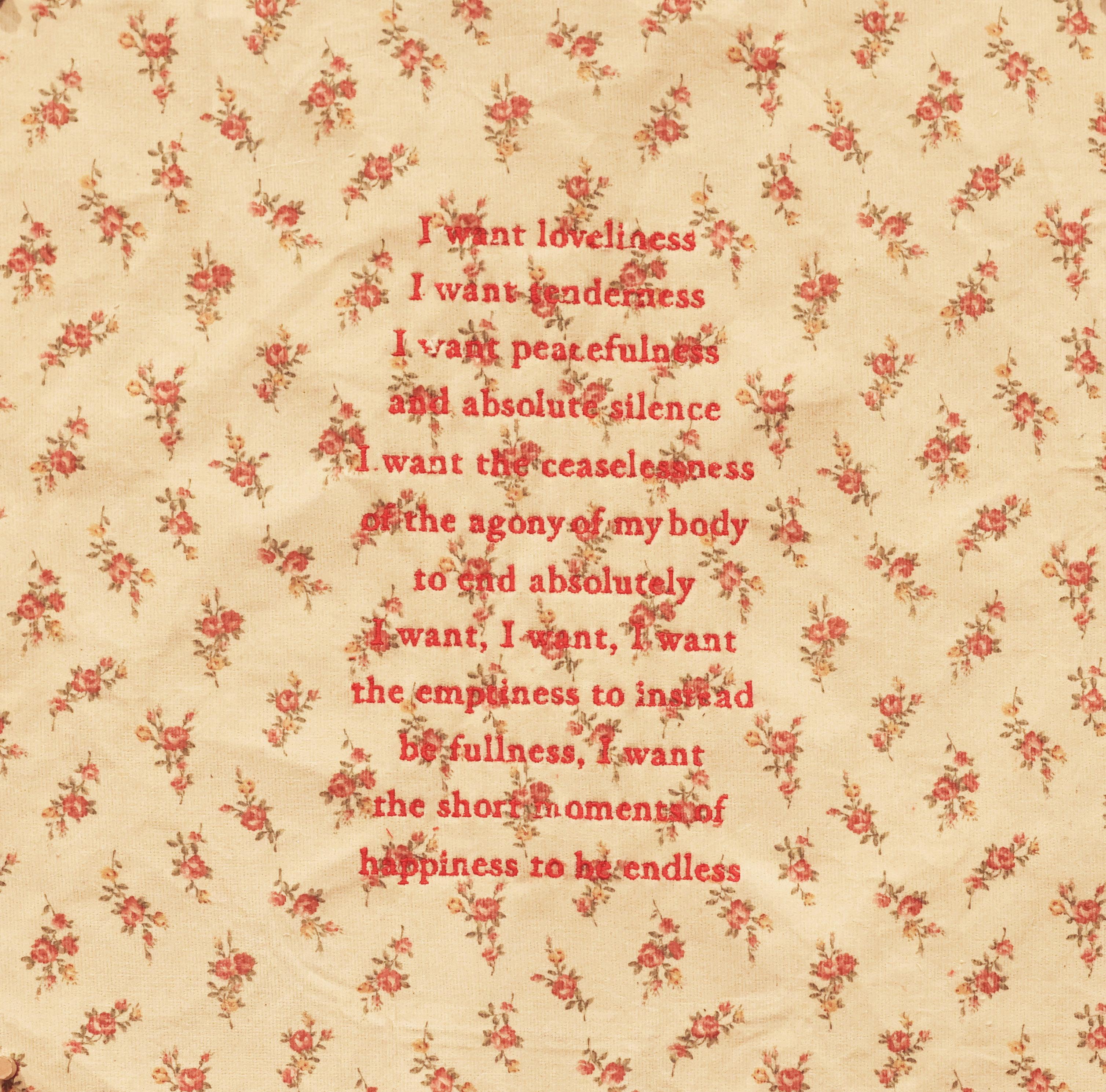 The artwork I create is deeply rooted within the textile medium, with a focus on quilting, weaving and embroidery. These disciplines were taught to me as a domestic craft by the women in my family; a history keep alive in the objects I create. My practice tries to underscore the softness, comfort and tactility of the embodied nature of textiles, while juxtaposing against aggressive, violent, and morbid conceptual frameworks.