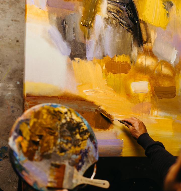 Colour is central to her work. She uses it deliberately to set mood, create tension, and build rhythm across surfaces. Whether in soft tonal layers or bold, saturated blocks, her colour choices act as emotional cues, guiding how a viewer feels their way through the work.