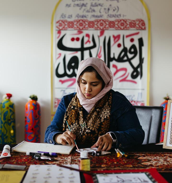 Halima Bhatti is a Hobart-based Arabic calligraphy artist. Her art practice is a deeply spiritual and meditative journey that merges traditional Arabic and Urdu calligraphic styles with contemporary expression. Through carefully crafted strokes and intricate patterns, her work explores universal themes of love, faith, peace, and inner stillness, often drawing inspiration from Quranic verses and Sufi poetry.
