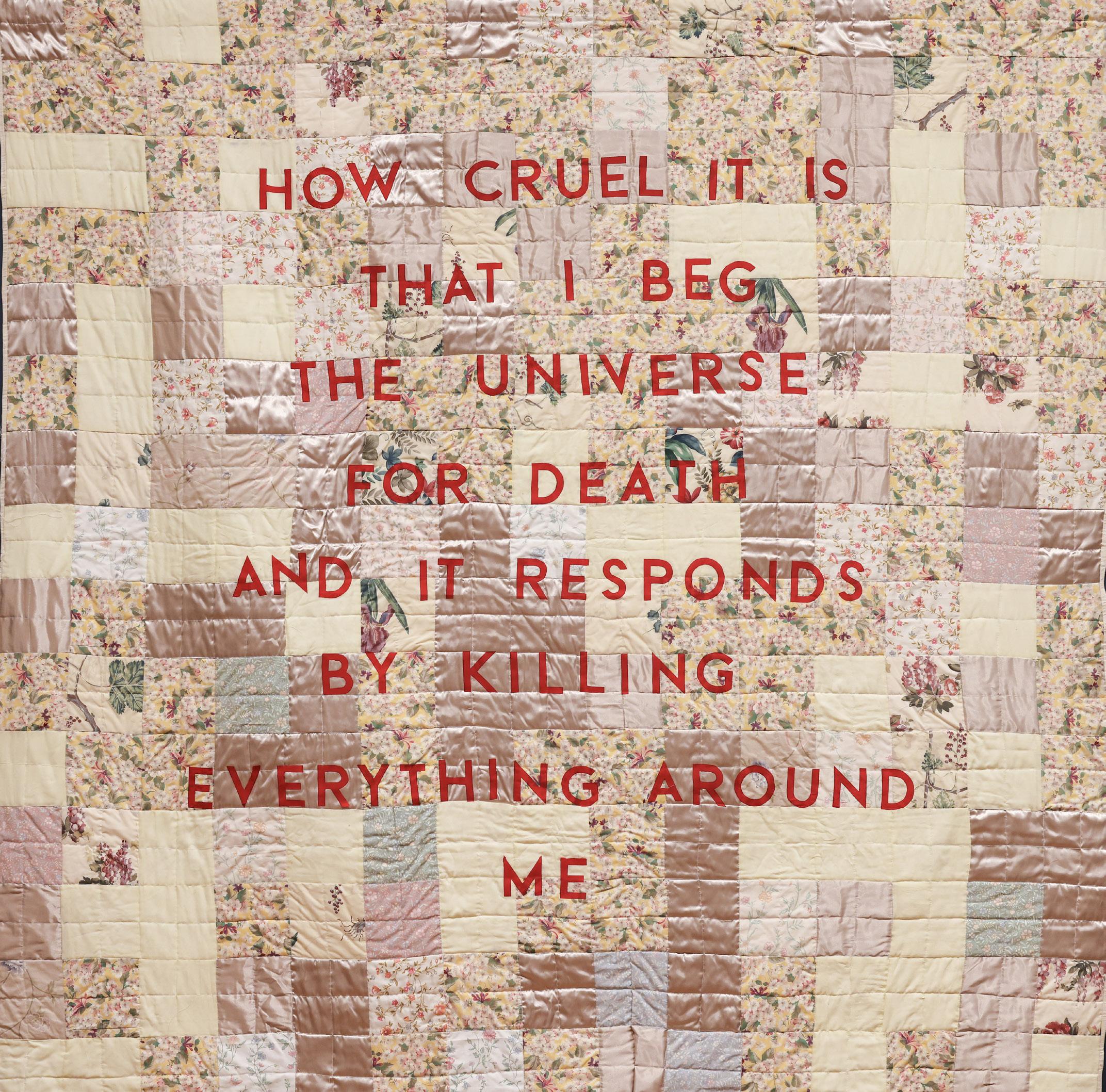 Each of the styles I undertake to create an artwork brings with it a long and storied history. I try to ensure that my practice honours and encapsulates these disparate qualities while adding my own. They become artefacts, each revealing and playing with the tension between the object and its audience the soft quilt saying something violent to those looking at it.