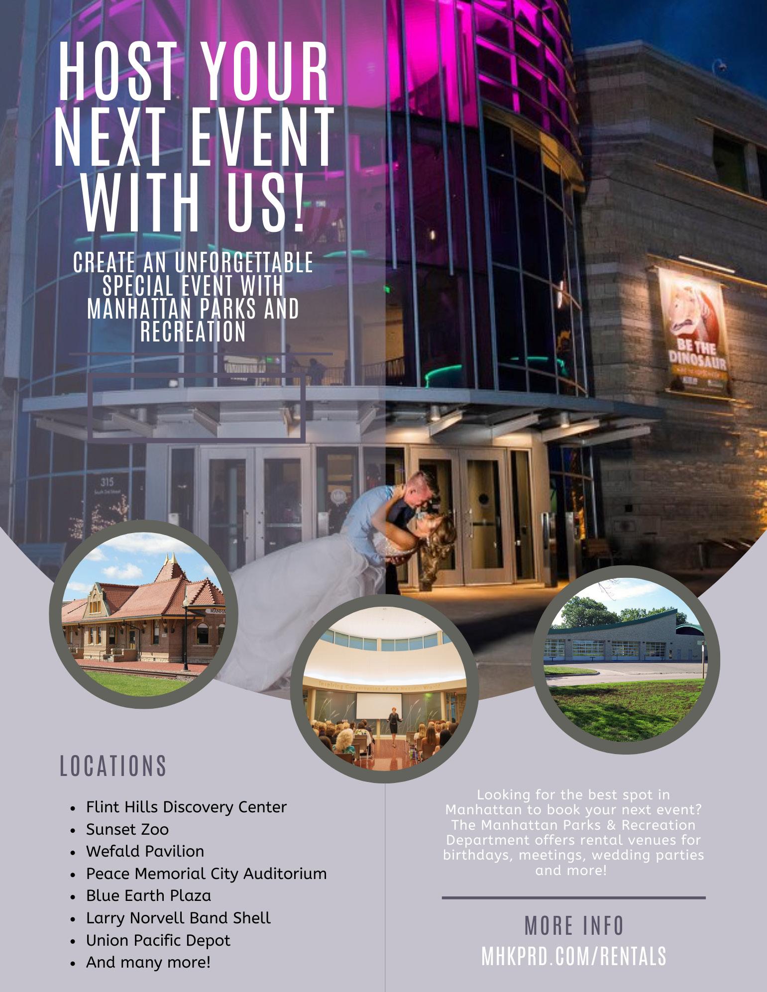 It is our policy to provide persons with disabilities an equal opportunity to participate in and enjoy the benefits of our services, programs, and activities. In order for us to provide reasonable accommodations, we ask that you request the assistance needed by contacting Parks and Recreation at 1101 Poyntz Avenue in Manhattan, or call 785-587-2757 (TDD Kansas Relay Center at 800-766-3777).