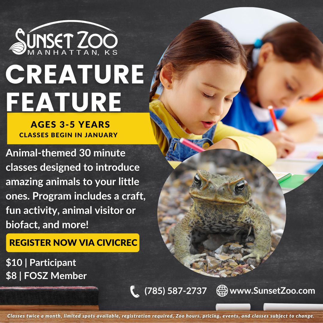 Help your child explore the natural world with these animal-themed classes at Sunset Zoo. This hands-on program will highlight a unique animal each November, December, January, and February. Staff will help children and their parent/guardian explore the animal’s individual characteristics through a variety of activities. Each Creature Feature class may go outside, so please dress accordingly. Parent/guardian must accompany child, and non-participating infants/toddlers are welcome to tag along. The registration fee only applies to participating children. Each class will last 30 minutes, and start promptly at 11:30 AM, and families are encouraged to extend their learning by visiting the Zoo after the class. Pre-registration required.