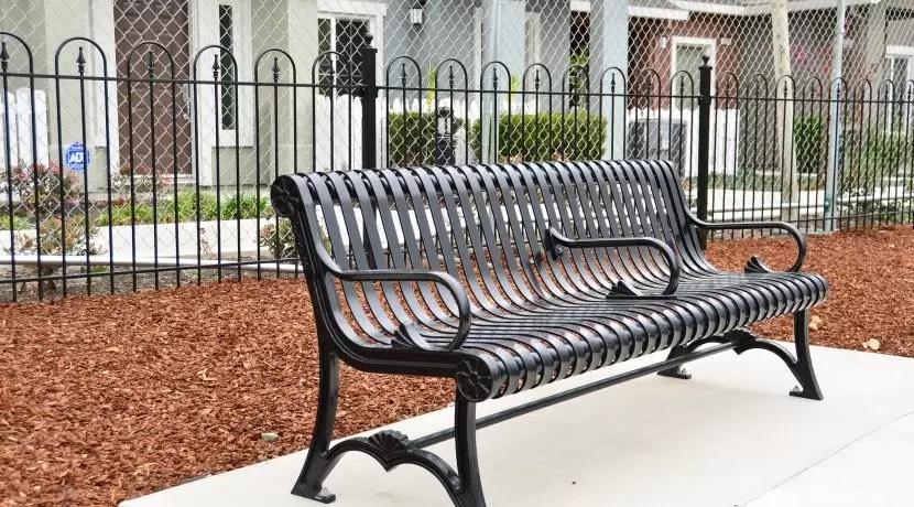 Park benches may be full-steel or steel-based with wood-style composite seating surfaces.