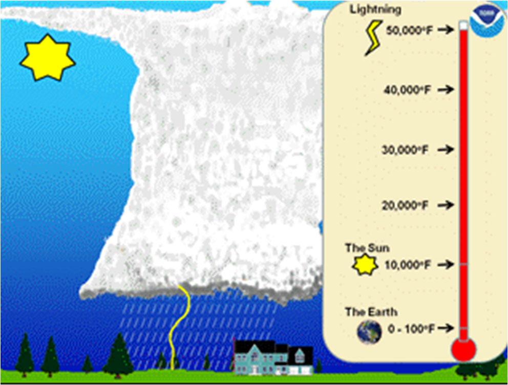For some people thunderstorms and lightning can be scary and it is easy to see why. According to the National Weather Service, lightning can be as hot as 50,000 degrees. Five times hotter than the surface of the sun. A typical lightning flash is about 300 million Volts and about 30,000 Amps.