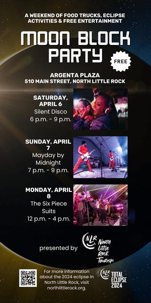 Tourism will host a free threeday Moon Block Party to celebrate the 2024 Total Solar Eclipse at Argenta Plaza, at 510 Main Street in North Little Rock Saturday, April 6, 2024 – Monday, April 8, 2024.