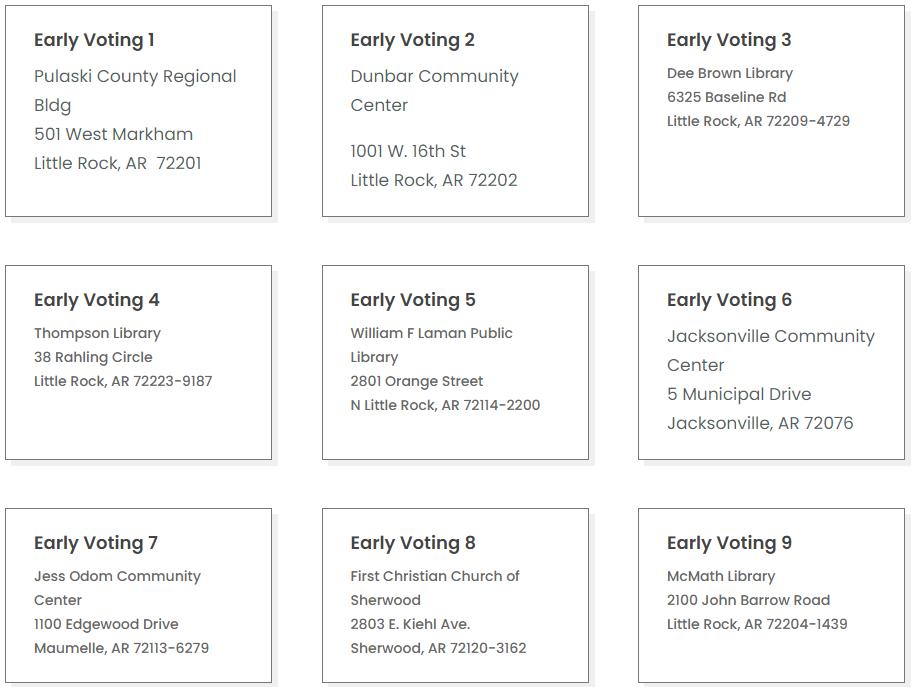 Note: North Little Rock Early Voting locations are: 2801 Orange Street—William F. Laman Library 604 N Locust—Shorter College Student Center