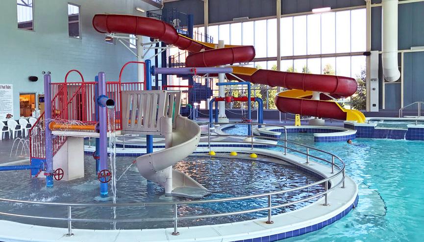 Pool parties are limited to a maximum of 150. The natatorium includes zero-depth pool entry, interactive play structures, three lap lanes, a lazy river, a vortex, and 185-foot water slide. A minimum one-hour rental is required.