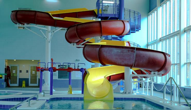 Pool parties are limited to a maximum of 150. The natatorium includes zero-depth pool entry, interactive play structures, three lap lanes, a lazy river, a vortex, and 185-foot water slide. A minimum one-hour rental is required.