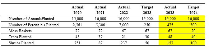 Some Performance Measures for 2023 in the chart below are higher than anticipated. For example, the number of Perennials Planted for 2023 is nearly double the anticipated number of plants. We continue to add perennial plants to the Renaud Center, O’Day Park, and the Krekel Center. The number of Shrubs Planted is higher than expected as we were able to source smaller, less expensive shrubs and we added shrubs to Fort Zumwalt Park, O’Day Park, and revitalized the front of the O’Fallon Senior Center all within budget. The number of moss baskets for 2024 is reduced due to the Main Street reconstruction project where the light poles have been removed for the project.