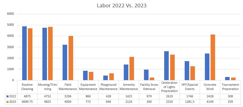 • Overall, the 2023 totals are consistent with past years. Some categories are up or down over 2022 totals. The weather each year has a direct influence on where the labor hours are spent.