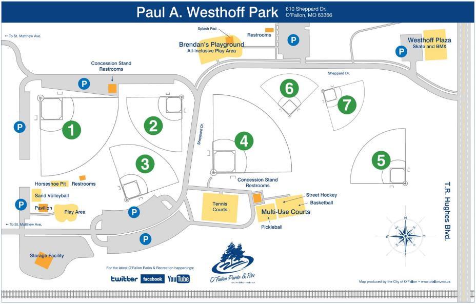Athletic Park – The department maintains four athletic parks, Dames Park, Ozzie Smith Sports Complex, Westhoff Park and Sports Park consisting of baseball/softball fields, soccer fields, Cricket and Lacrosse. Other amenities you will find in these parks are volleyball, horseshoes, tennis, basketball, roller hockey, basketball, pickleball and 6 rentable pavilions. These parks are host to many tournaments and recreational programs. Ozzie Smith