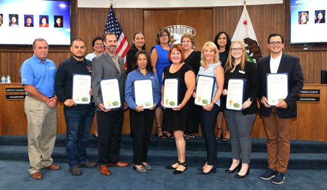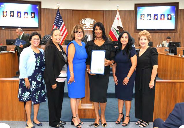 The City again hosted free summer concerts this year. The City Council thanked the sponsors who helped make the shows possible at its September 6 meeting. From left: Councilmember Annette C. Delgadillo, Vice Mayor Isabel Aguayo, Mayor Vilma Cuellar Stallings, Senior Director of Government Relations and Public Affairs Leeor Alpern of World Energy, Lauren Yokomizo representing Los Angeles County Supervisor Janice Hahn, Councilmember Brenda Olmos, and Councilmember Peggy Lemons. Unable to attend were representatives from Assemblymember Anthony Rendon’s office and Downey Federal Credit Union.