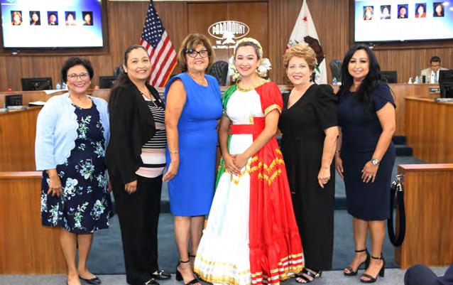 At the September 6 meeting of the Paramount City Council, Andrea Ríos, a folklorico dancer with the Latinas Art Foundation and a senior at Paramount High School, led the Pledge of Allegiance in celebration of National Hispanic Heritage Month. From left: Councilmember Annette C. Delgadillo, Vice Mayor Isabel Aguayo, Mayor Vilma Cuellar Stallings, Rios, Councilmember Peggy Lemons, and Councilmember Brenda Olmos.