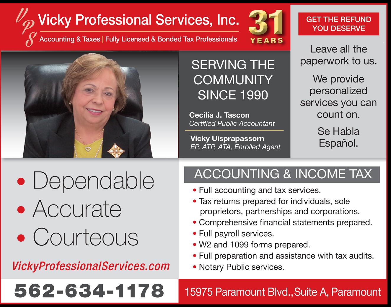 Vicky Professional Services (562-634-1178): 20% off bookkeeping and accounting service.