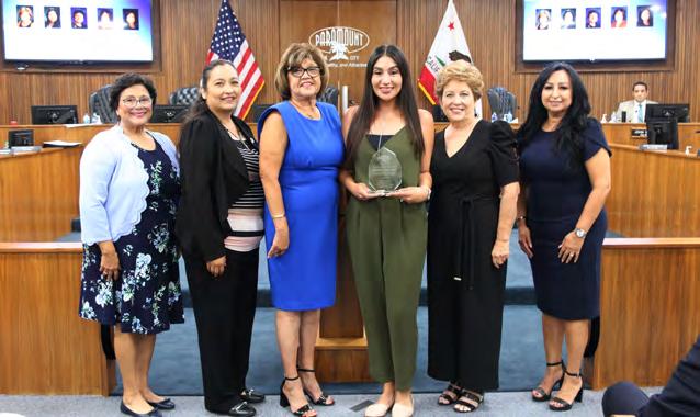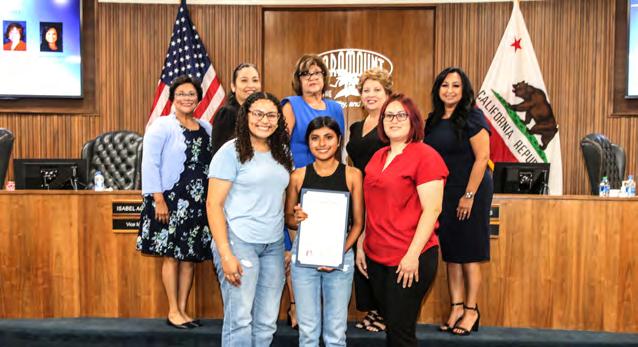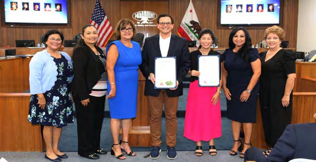 National Hispanic Heritage Month, which runs from September 15 to October 15, was proclaimed by the Paramount City Council at its September 6 meeting. With this year’s theme of “Unidos: Inclusivity for a Stronger Nation,” the month pays tribute to the achievements and contributions that generations of Hispanic Americans have made to the nation, and honors the cultural legacy shared by many Paramount residents. Accepting the City’s proclamation were student members of the Paramount High School club Raices Unidas Jacqueline Perez and Joany Martinez, and club advisor Maria Sevilla. Back row: Councilmember Annette C. Delgadillo, Vice Mayor Isabel Aguayo, Mayor Vilma Cuellar Stallings, Councilmember Peggy Lemons, and Councilmember Brenda Olmos. Front row: Perez, Martinez, and Sevilla.