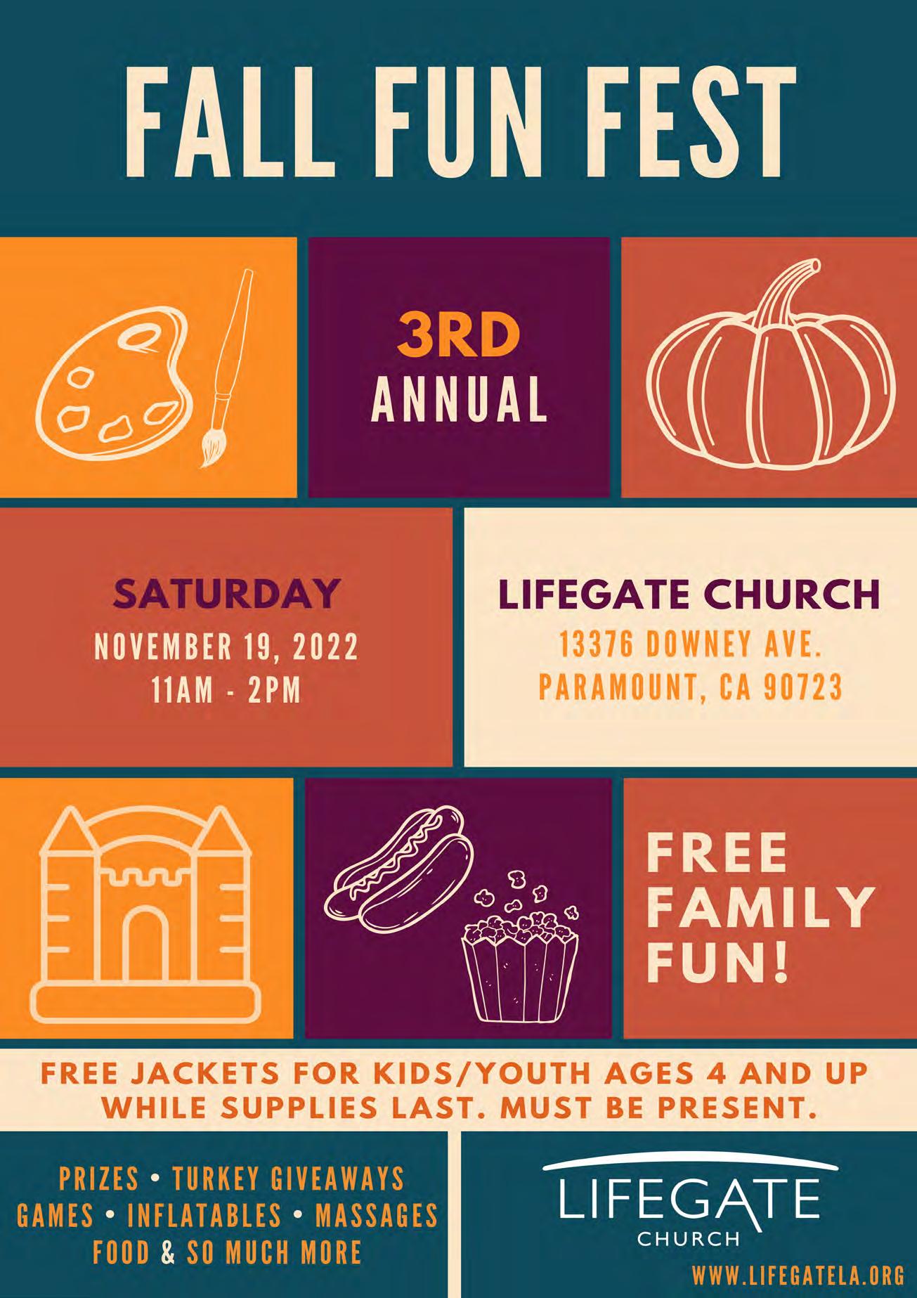 ¡Festival de otoño! • Sábado, 19 de noviembre, 11 a.m.-2 p.m. • ¡Diversión familiar gratis! • Chaquetas gratis para niños y niñas de 4 años en adelante hasta agotarese (tiene que estar presente) • Premios, sorted de pvo juegos, inflatables, masajes, comida, musica, mucho mas • Lifegate Church, 13376 Downey Ave., Paramount, CA 90723.