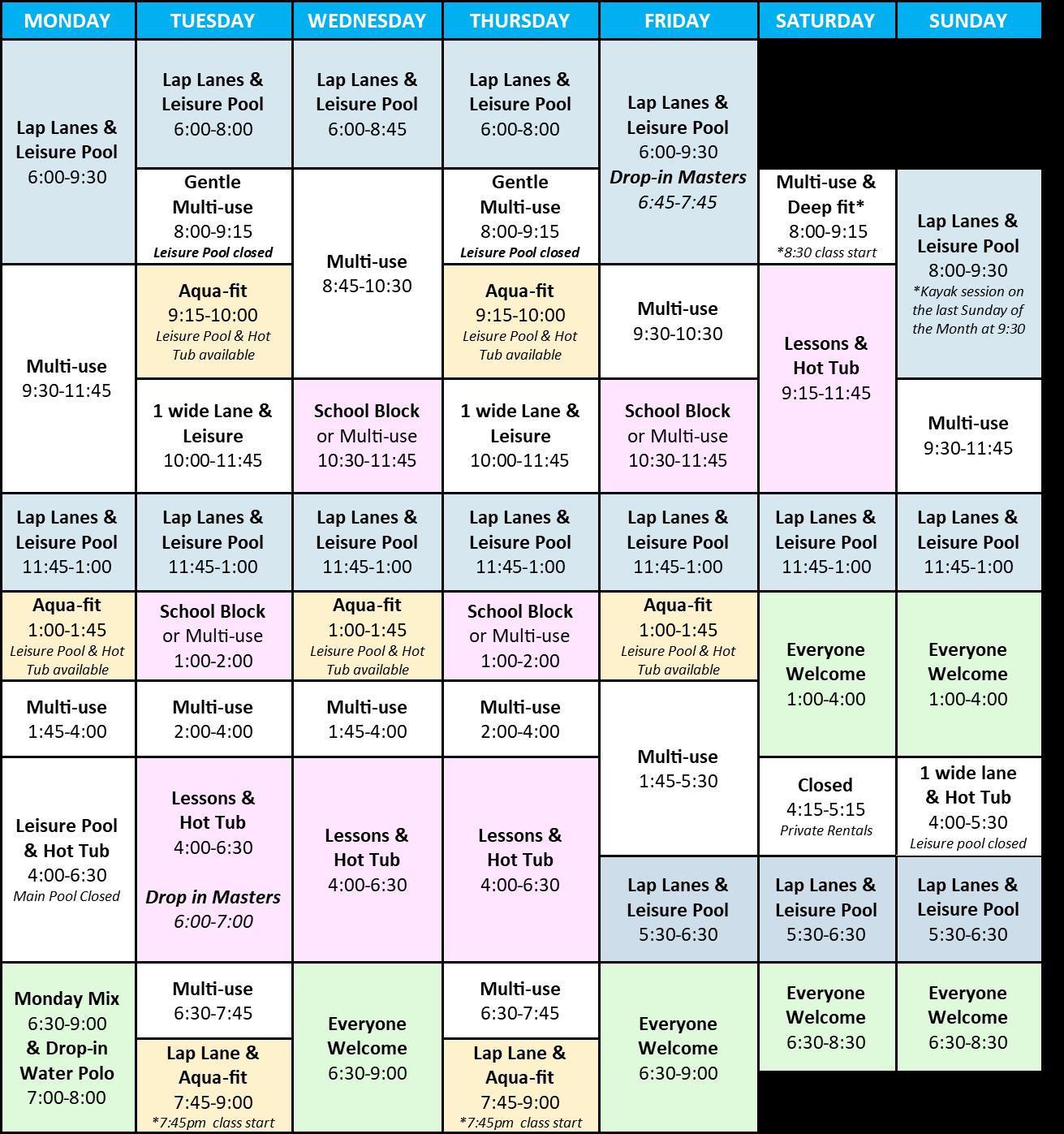 As part of your membership or daily drop in admission, enjoy options to attend morning, afternoon, evening, or weekend aqua fit classes. Various instructors will lead a 45 minute class.