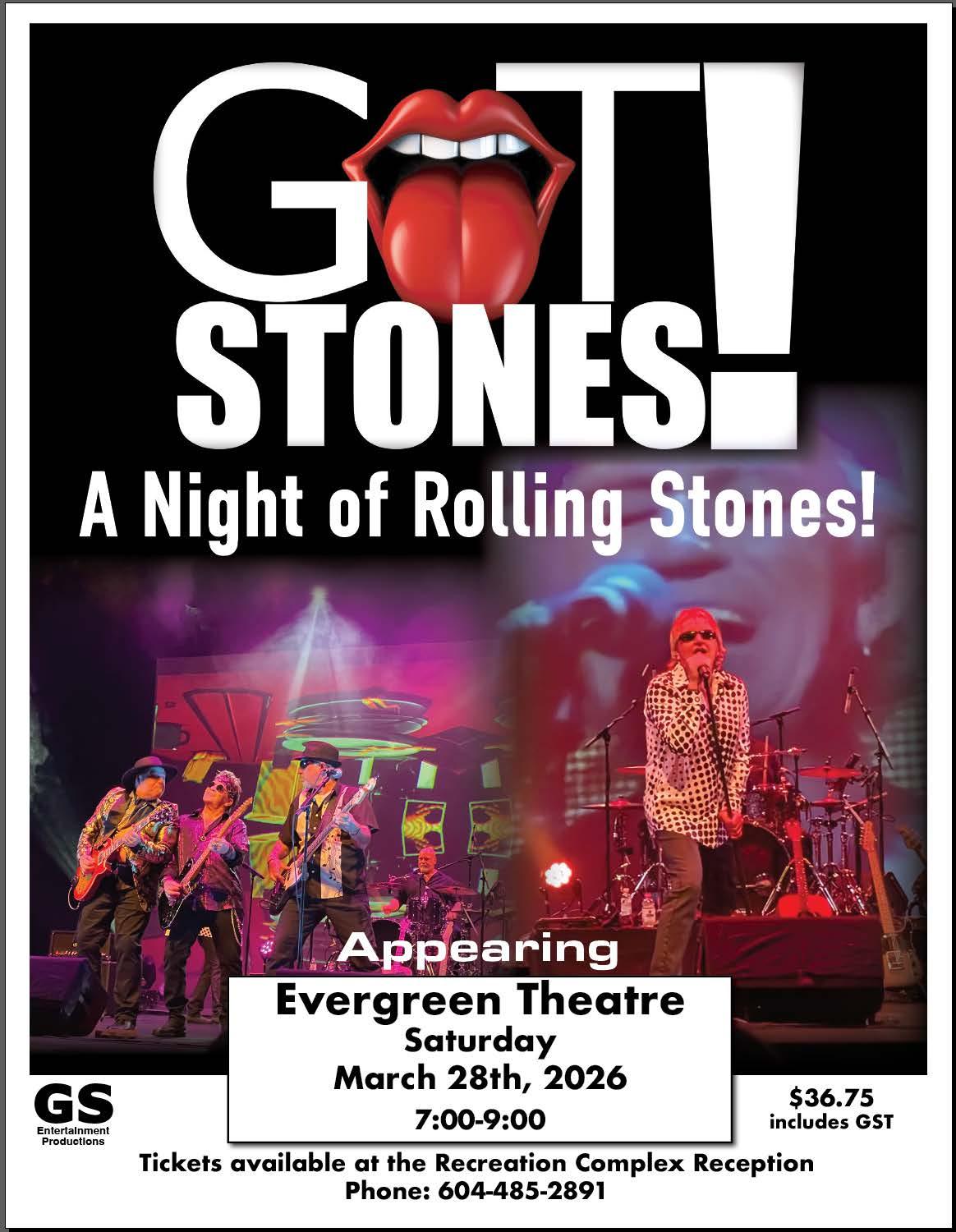 GOT STONES? THE ULTIMATE ROLLING STONES EXPERIENCE. SATURDAY, MARCH 28 AT THE EVERGREEN THEATRE. TICKETS $36.75 INCLUDING GST. FOR MORE INFO SEE PAGE 7. TH