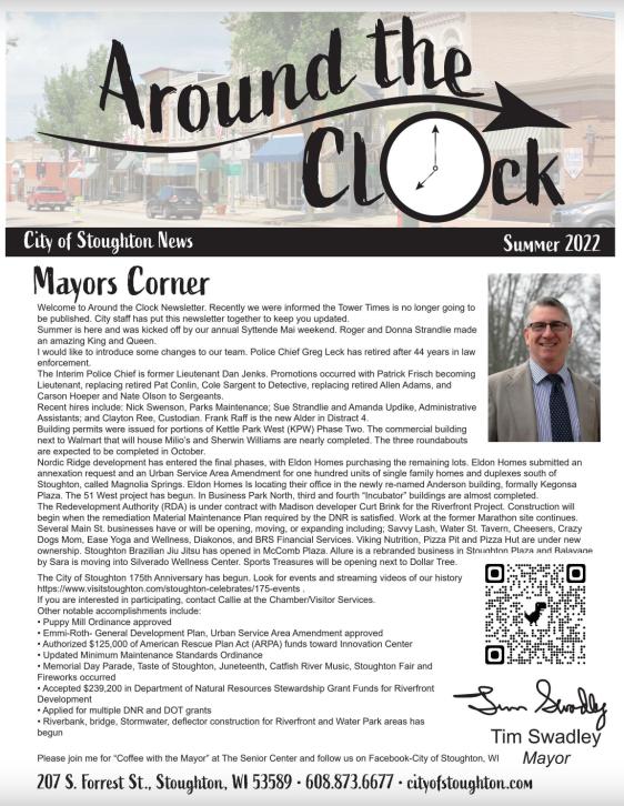 Tim Swadley Mayor 207 S. Fo est St., Stoughton, WI 53589 • 608.873.6677 • cityofstoughton.com Cl ck City of Stoughton News Fa 2022