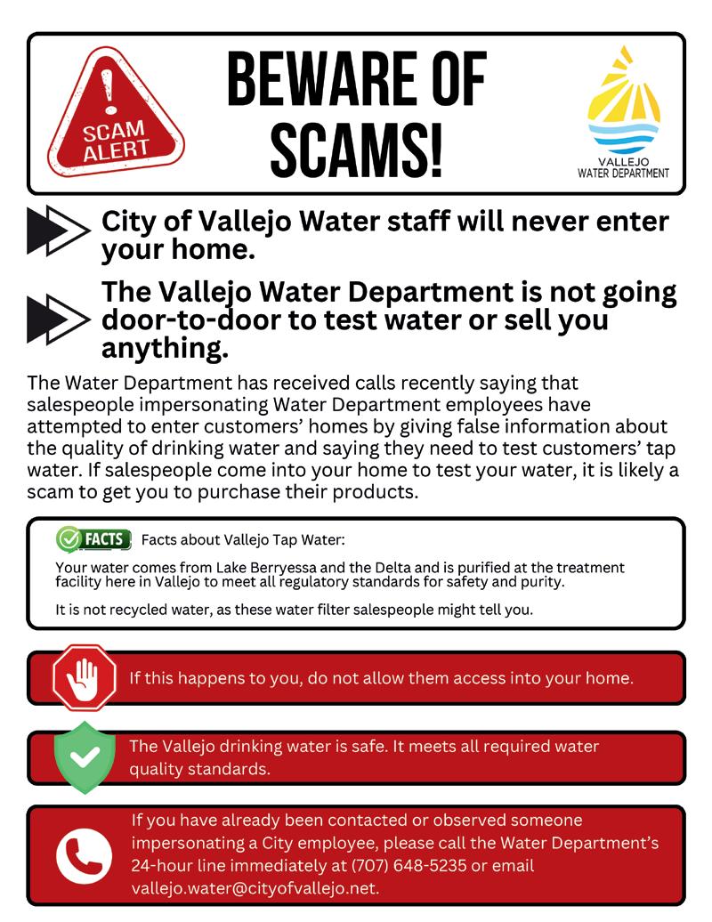 * As a reminder, while we conduct thousands of water quality tests each year, the City of Vallejo will never request access into your home to perform water testing.