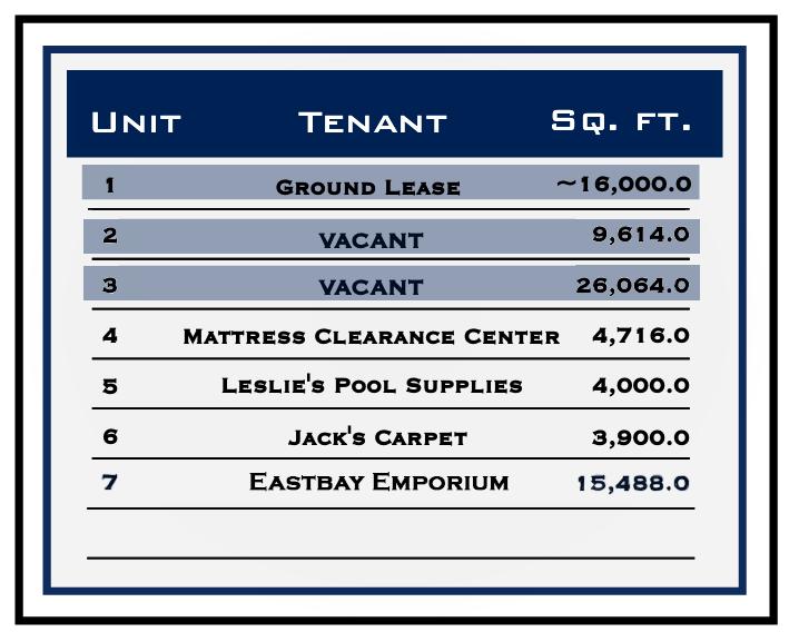 While the center is anchored by Eastbay Emporium, Jack’s Carpet, and Leslie’s Pool Supplies, it adjoins neighboring center, Bay Way I to the east, which is home to Buck Wild Nightclub.
