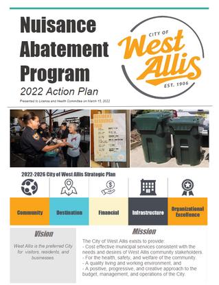 The WAHD served in a leadership role to the development, coordination, and implementation of the City of West Allis Nuisance Abatement Program Action Plan. This included working with city leadership staff and Alderpersons to develop new enforcement code. Furthermore, the WAHD initiated health in all policies/programs training for all city departments. This was done in partnership with the University of Wisconsin Population Health Institute and others.