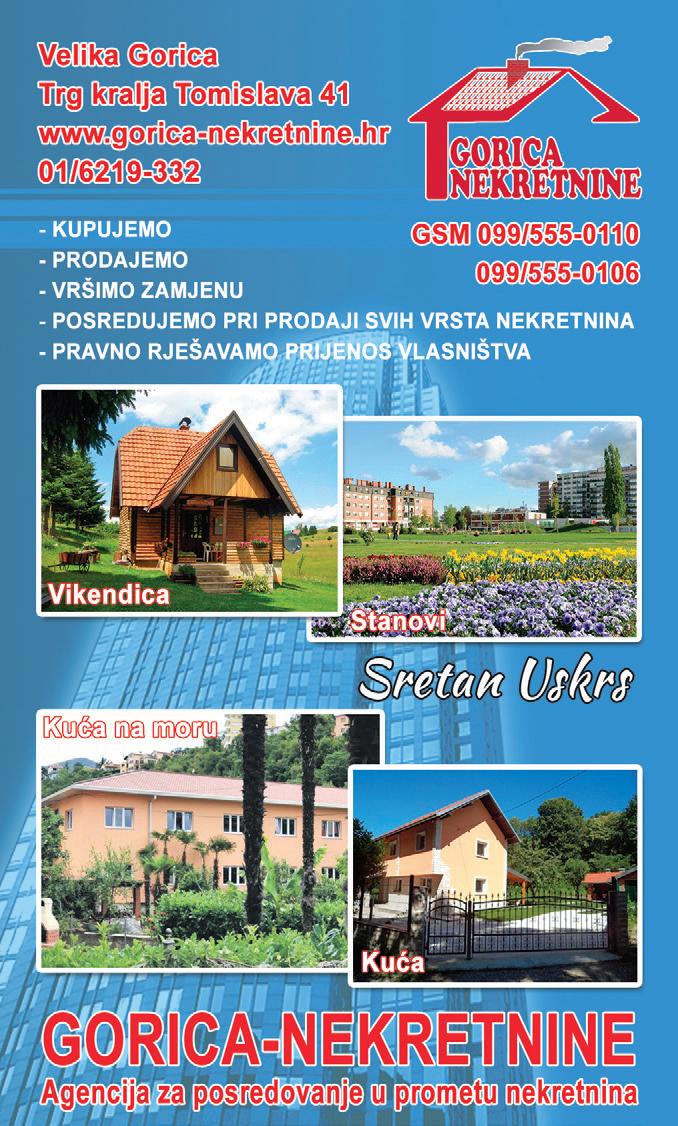 Velika Gorica, Kokotovo naselje, dvojna kuća prizemnica tlocrtne površine 78 m2 i okućnice 360 m2, garaža 34 m2, priključak plina, kuća je građena prije 1968 god., 72.000 € www.gorica-nekretnine.hr 099 555 0110 Velika Gorica, Buševec, samost. prizemnica površine 80 m2 , te okućnice 6960 m2, uz kuću se nalazi pomoćni objekt u kojemu su dvije garaže i spremišta, građena prije 1968.god., 60.000 € www.gorica-nekretnine.hr 091 535 1146
