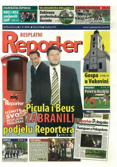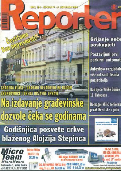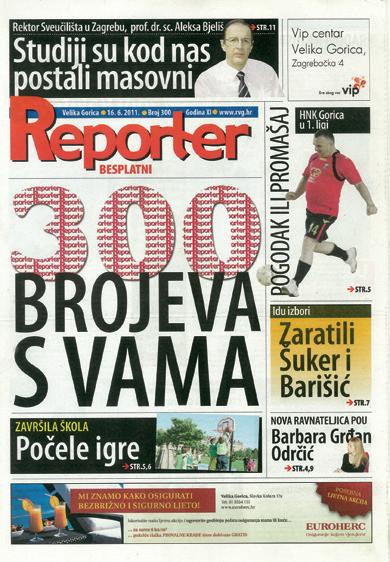 vesti, s tim se ne mogu nositi. I koliko god je nedvojbeno da i one svejedno moraju zadržati barem dio obaveze da informiraju, donose vijest, toliko je jasno da je taj segment smisla tiskanih novina duboko u 21. stoljeću postao - sekundaran. U ovom formatu, magazinskom koliko je to moguće izvesti, u prvom vam redu želimo donositi priče. Zagrebati ispod površine, doznati za vas kakvi se ljudi kriju iza velikih uspjeha, fascinantnih dosega i posebnosti svih vrsta. Želimo Vam kroz ljude, kroz njihove priče i iskustva, kroz njihove sudbine, predstaviti ljude koji su drukčiji, uspješniji, bolji i sretniji. I tako iz mjeseca u mjesec. Reporter nekad nije bio besplatan, ova stara naslovnica gore, iz 2004. godine, podsjeća da je cijena bila osam kuna, ali i to se odavno promijenilo. Danas je besplatan, možete ga pronaći na nekoliko "spotova" po gradu, u seoskim trgovinama, u ka ćima, a možda i na stanici, čekajući autobus prema Zagrebu. I ako vam barem malo skratimo dosadnu vožnju u busu, već smo puno napravili... Redakcija Reportera