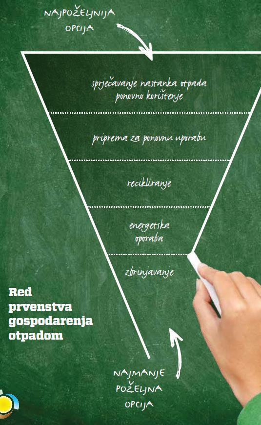 Najbolja mogućnost je prestati stvarati otpad. Kad to nije moguće, drugi dobri izbori uključuju ponovnu uporabu, recikliranje i obnavljanje. Dobrim gospodarenjem otpadom može se dati veliki doprinos gospodarskom rastu i stvaranju radnih mjesta. Na taj se način čuvaju vrijedni resursi, izbjegavaju skupe operacije čišćenja i sprječavaju zdravstveni problemi.