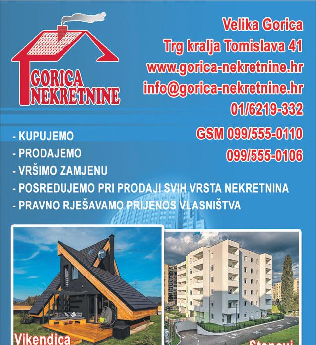 Velika Gorica, Rakitovec, samost. prizemnica površine 67 m2 (za adaptaciju ili rušenje), građena prije 1968.god, a sastoji se od: 3 sobe i pomoćne prostorije, na zemljištu od 525 m2 nalazi se pomoćni gospodarski objekt te vrt od 79 m2, 25.000 € www.gorica-nekretnine.hr 099 555 0110 Jagodno, samost. kuća površine 215 m2 i okućnice 600 m2, podrum, prizemlje i kat, Rješenje o izvedenom stanju, mogućnost zamjene za stan 40-50 m2 u V. Gorici ili N. Zg,, 120.000 € www.gorica-nekretnine.hr 099 555 0106 Pokupsko, Gornja Bučica, kuća 70 m2 i okućnice 679 m2, prizemlje i potkrovlje, zidani objekt (podrum 10x10), gradski vodovod, građevinska dozvola, 22.000 € www.gorica-nekretnine.hr 099 555 0106 Velika Mlaka, dvojna kuća katnica površine 130 m2 i okućnice 131 m2, p, k i p, dvije garaže, posjeduje Rješenje o izvedenom stanju, 140.000 € www.gorica-nekretnine.hr 091 535 1146
