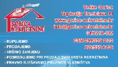 Velika Gorica, Centar, kuća katnica stambene površine 300 m2 i okućnice 611 m2 koja se sastoji od podruma (velika otvorena prostorija, vešeraj, garaža za 2 automobila), prizemlja (hodnik, kuhinja s blagovaonom, d. boravak sa izlazom na terasu), kata (isti raspored kao prizemlje) i potkrovlja (roh bau). Cijela kuća povezana je unutarnjim stepeništem. Posjeduje Rješenje o izvedenom stanju, 290.000,00 € www.gorica-nekretnine.hr 099 555 0106 Velika Gorica, Petrovina, samost. visoka prizemnica površine 200 m2 i ograđene okućnice 1022 m2. Sastoji se od prizemlja i visokog potkrovlja povezanih unutarnjim i vanjskim stepeništem, u dvorišnom dijelu pomoćni objekt, 120.000 € www.gorica-nekretnine.hr 099 555 0106